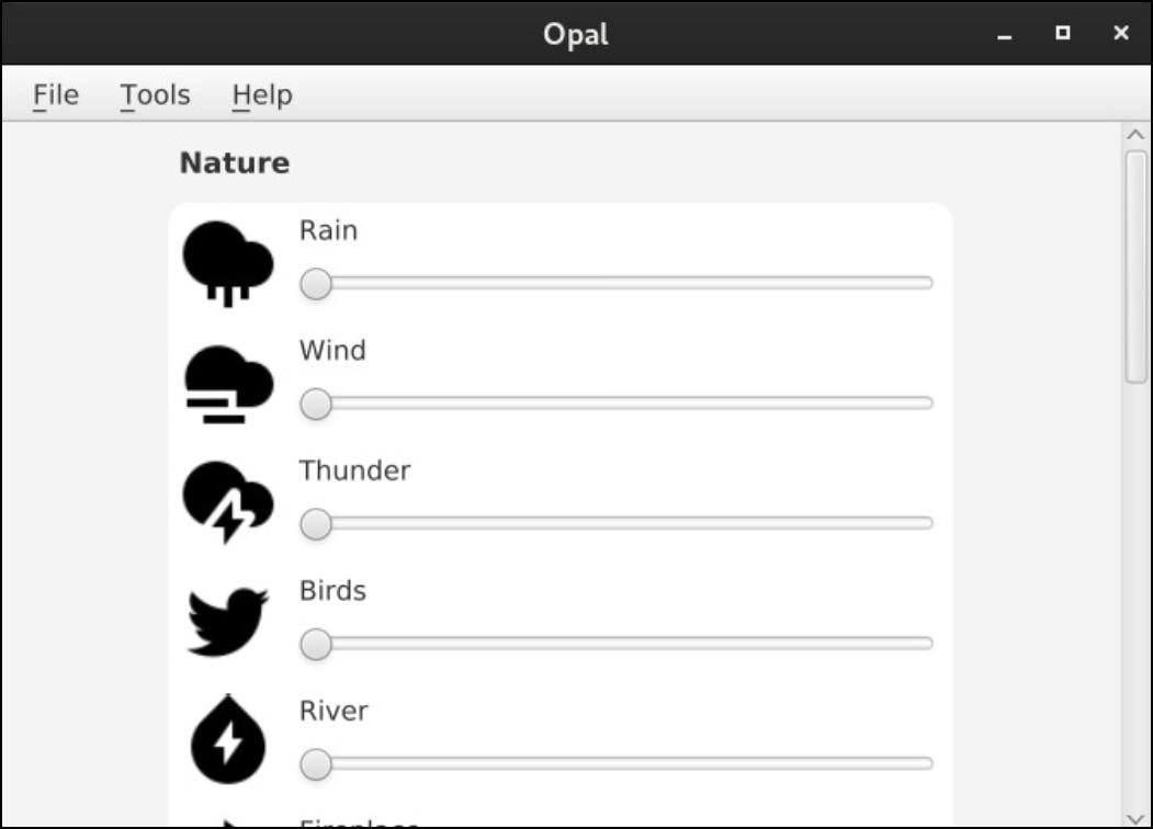 Available sounds: Rain, Thunderstorm, Wind, Forest with Birds, Leaves, Water stream, Seaside with seagulls and relaxing waves, Water, Fireplace, Summer night with owls and crickets, Fan, rumbling Train, Coffee Shop, White Noise, Pink Noise, Brown Noise.