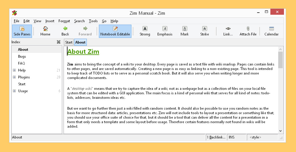 Zim is a graphical text editor used to maintain a collection of wiki pages. Each page can contain links to other pages, simple formatting and images. Pages are stored in a folder structure, like in an outliner, and can have attachments. Creating a new page is as easy as linking to a nonexistent page. All data is stored in plain text files with wiki formatting. Various plugins provide additional functionality, like a task list manager, an equation editor, a tray icon, and support for version control.