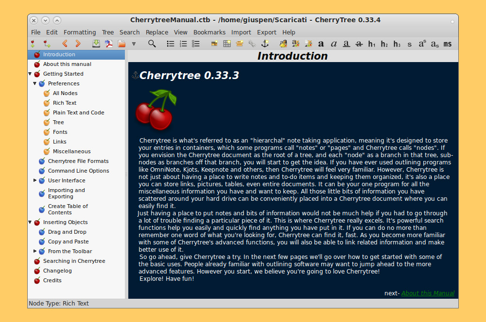 Cherrytree is a free and open source, hierarchical, note-taking application. It can store text, images, files, links, tables, and executable snippets of code, featuring rich text and syntax highlighting, storing data in a single xml or sqlite file. CherryTree is an option you should seriously consider because it lets you organize notes in a smart and logical way. Don’t get deceived by its seemingly simple interface – CherryTree has so many features that I could write a book about it.