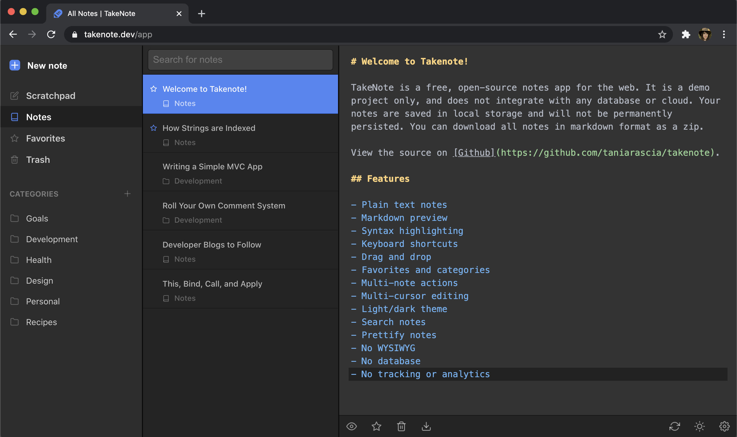 TakeNote is a free, open-source notes app for the web. It is a demo project only, and does not integrate with any database or cloud. Your notes are saved in local storage and will not be permanently persisted, but are available for download. No database – notes are only stored in the browser’s local storage and are available for download and export to you alone