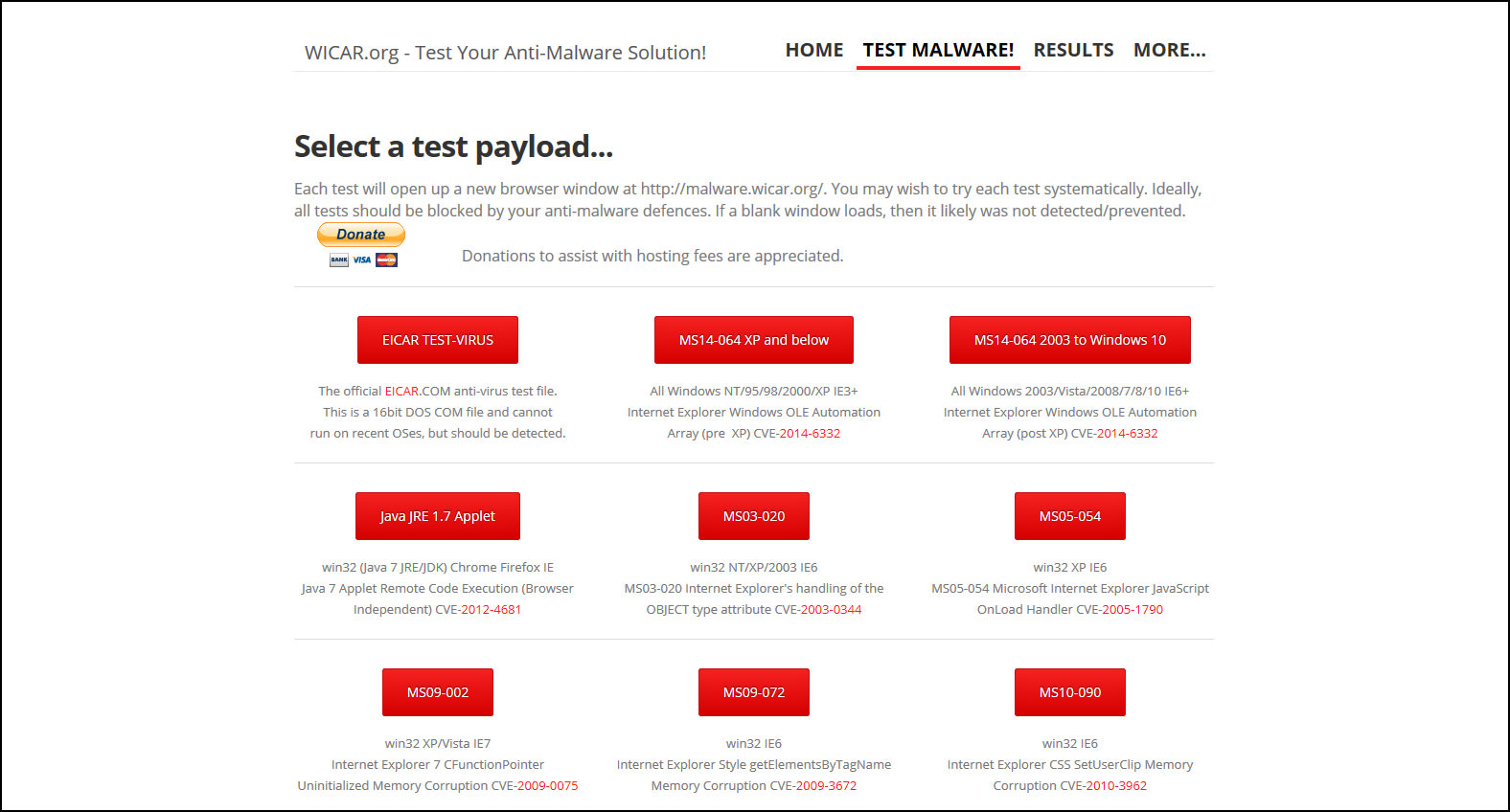 The Test Malware! page contains widely abused browser exploits you may safely click on, to test your defences. Donations to assist with the operational and hosting costs are welcome.