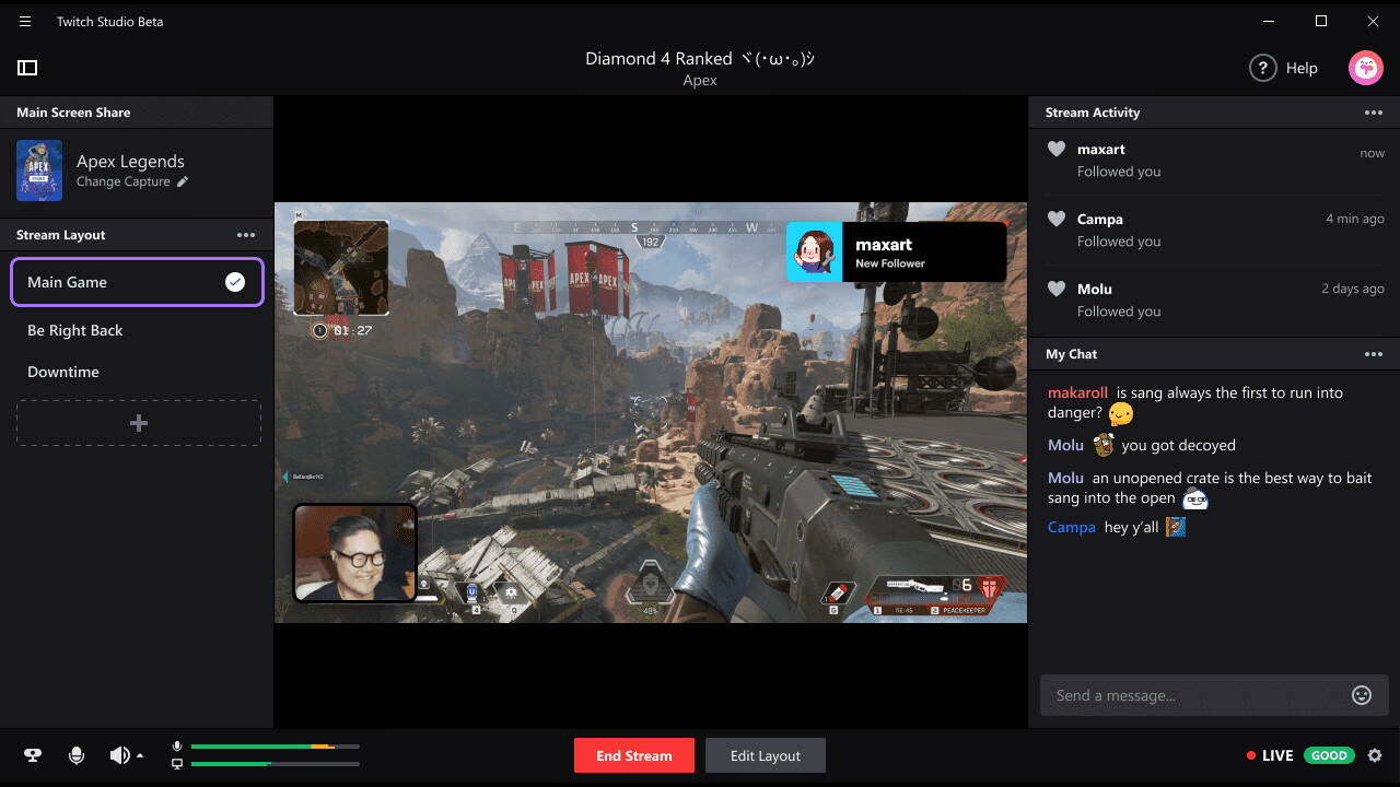 Streamlabs has everything you need to stream and create a memorable brand. Broadcast your live stream to Twitch, YouTube, Facebook, or Trovo. Optimized for the best video and audio quality — capture your webcam, games, desktop, music, and microphone in one place. Create custom scenes for getting started, BRB, stream ending, and more.