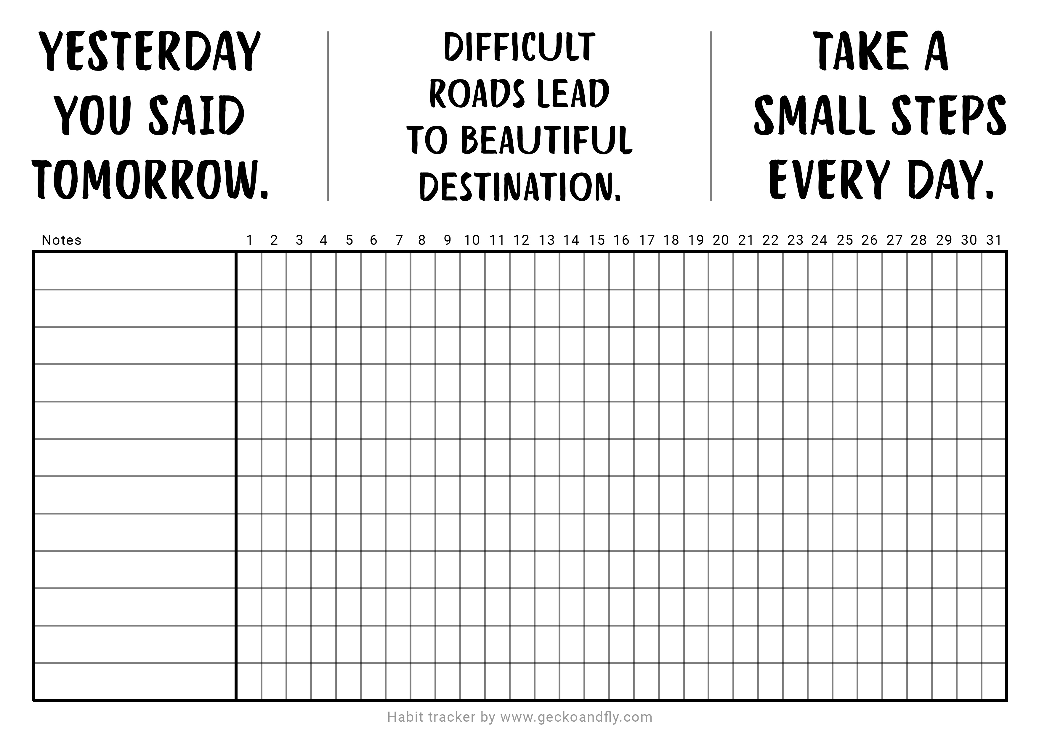 Anyway, above is a printable daily/monthly habit tracker with motivation quotes. 3 quotes that I find very helpful. They are “Yesterday you said tomorrow.”, “Difficult roads lead to beautiful destination.”, and “Take a small steps every day.”