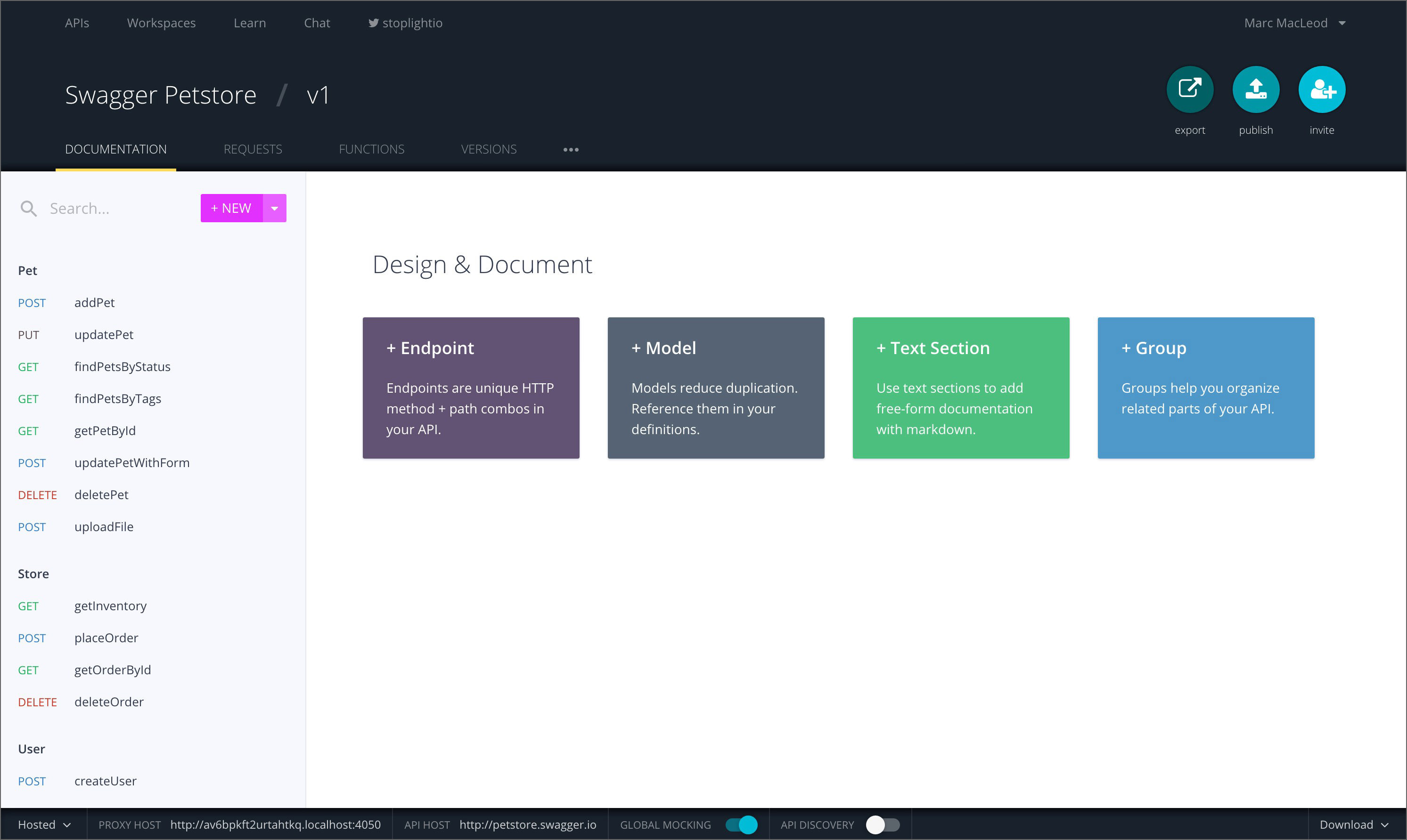 Best in class API Design, Docs, Mocking, and Testing. Stoplight leverages your OpenAPI documents to drive the entire API development process. Create OpenAPI Specifications (formerly known as Swagger) 10x faster with no specialized knowledge required. Combine OpenAPI documents with Markdown to create beautiful documentation for internal and external stakeholders. Instantly turn any OpenAPI document into a mock server. Leverage contract testing to ensure that your Single Source of Truth – OpenAPI Specification – accurately describes your APIs.