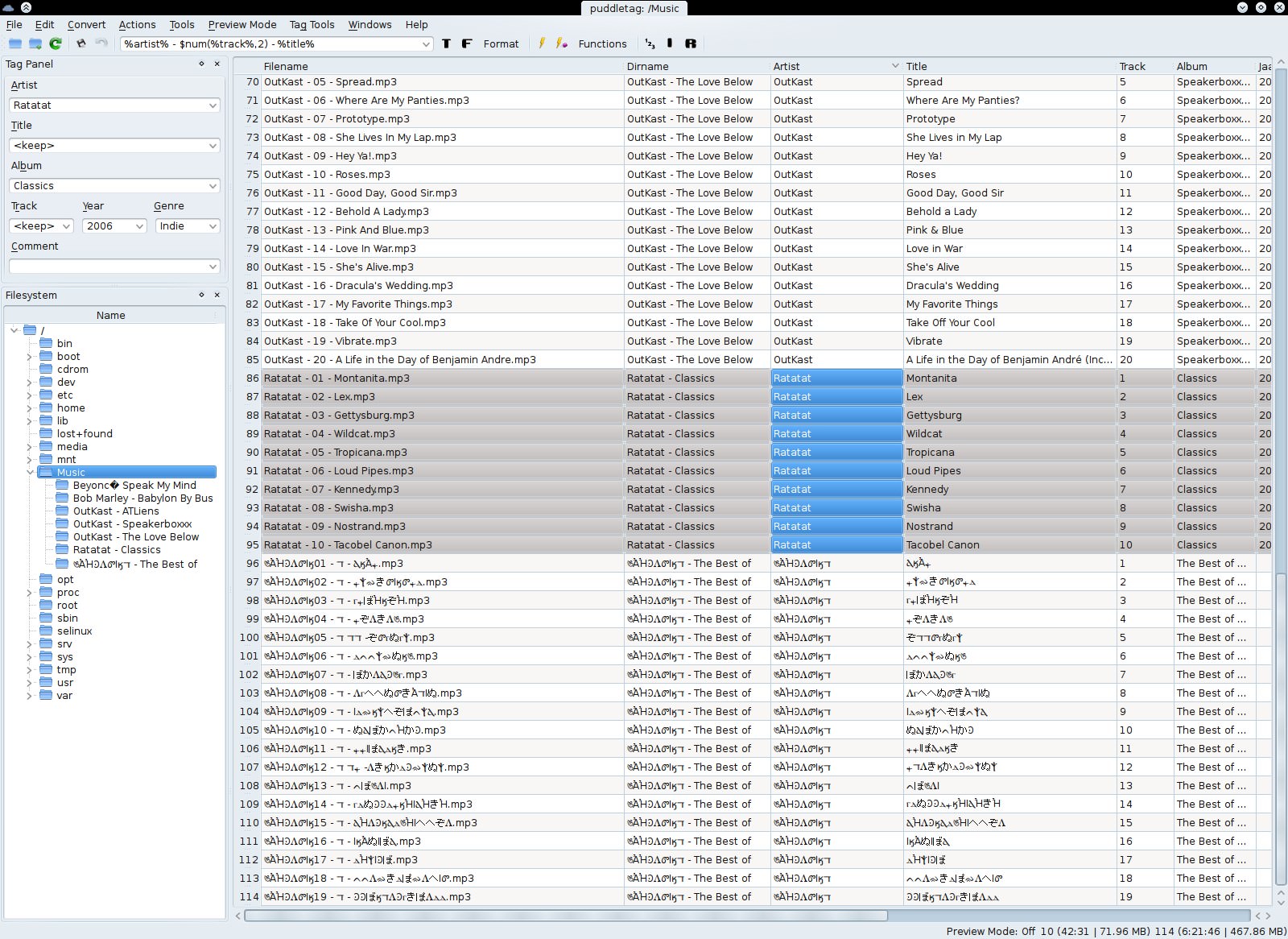 puddletag is an audio tag editor (primarily created) for GNU/Linux similar to the Windows program, Mp3tag. Unlike most taggers for GNU/Linux, it uses a spreadsheet-like layout so that all the tags you want to edit by hand are visible and easily editable. The usual tag editor features are supported like extracting tag information from filenames, renaming files based on their tags by using patterns and basic tag editing.