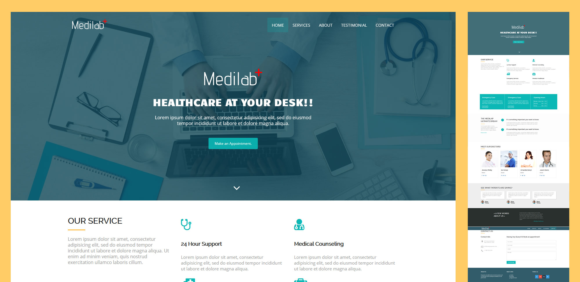 Medilab is a clean, free, responsive bootstrap template perfect for hospitals, doctors, clinics, medical, health and more. This is a fully dynamic, well structured, easy to use and beautiful free HTML5 template. This free website template was developed and designed specially for Medical purposes.