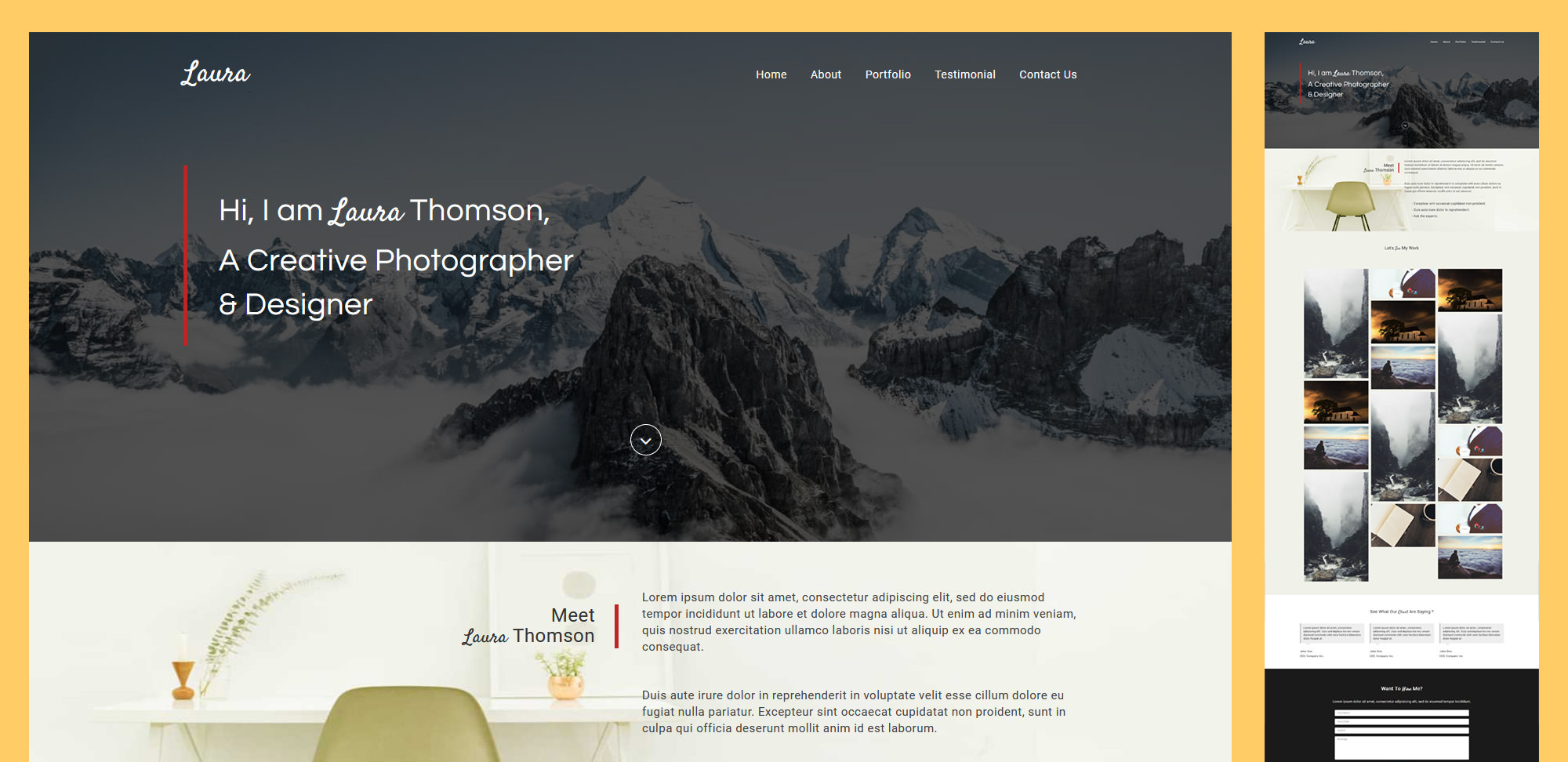 Laura free portfolio template is designed for startups businesses, new agencies, photography studios or web developers. It’s a one-page template, rich in all colors and options. This free template will make your website compatible with any device such as phones, tablets, laptops and desktop computers.
