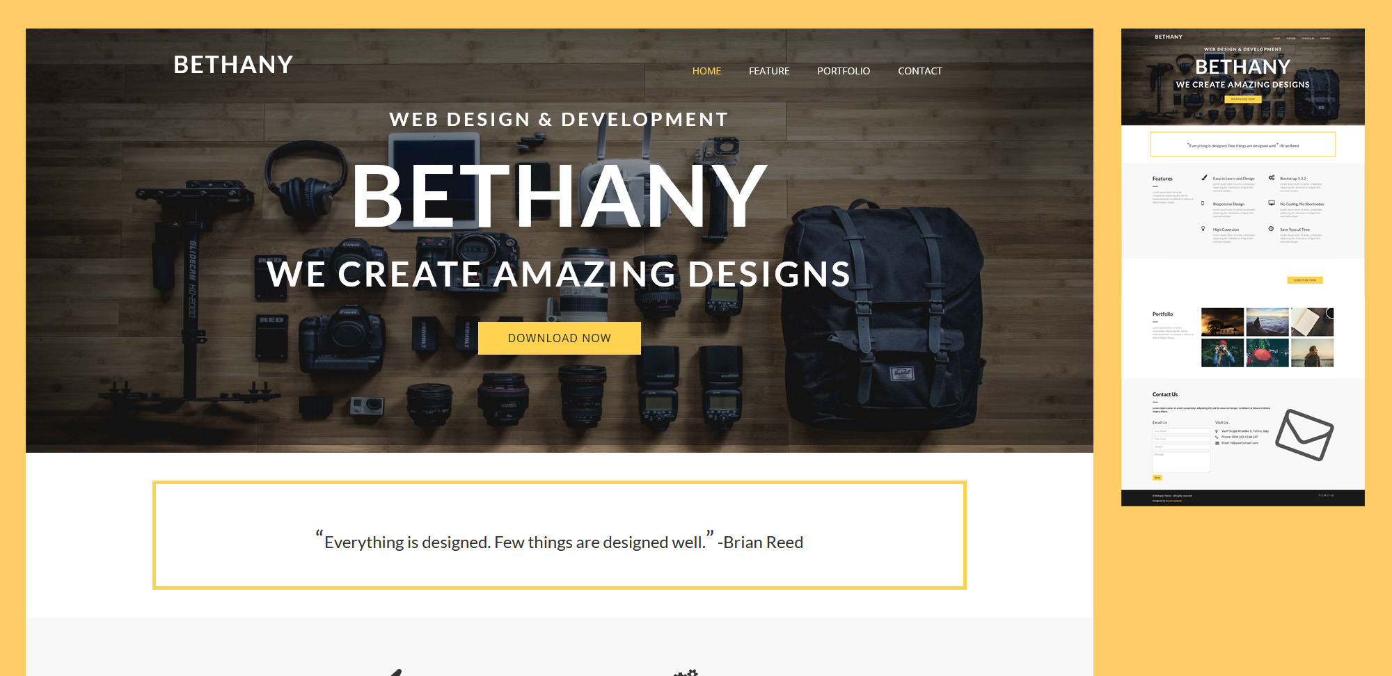 Bethany is a stylish and unique free bootstrap template for modern web designers. It comes with clean and flat style, it fits you who like minimal and modern design. This free bootstrap website template is used for creative agency, portfolio, photography and corporate business. It has HTML and CSS-based design templates for buttons, forms, typography, navigation and other interface components, as well as alternate JavaScript extensions.