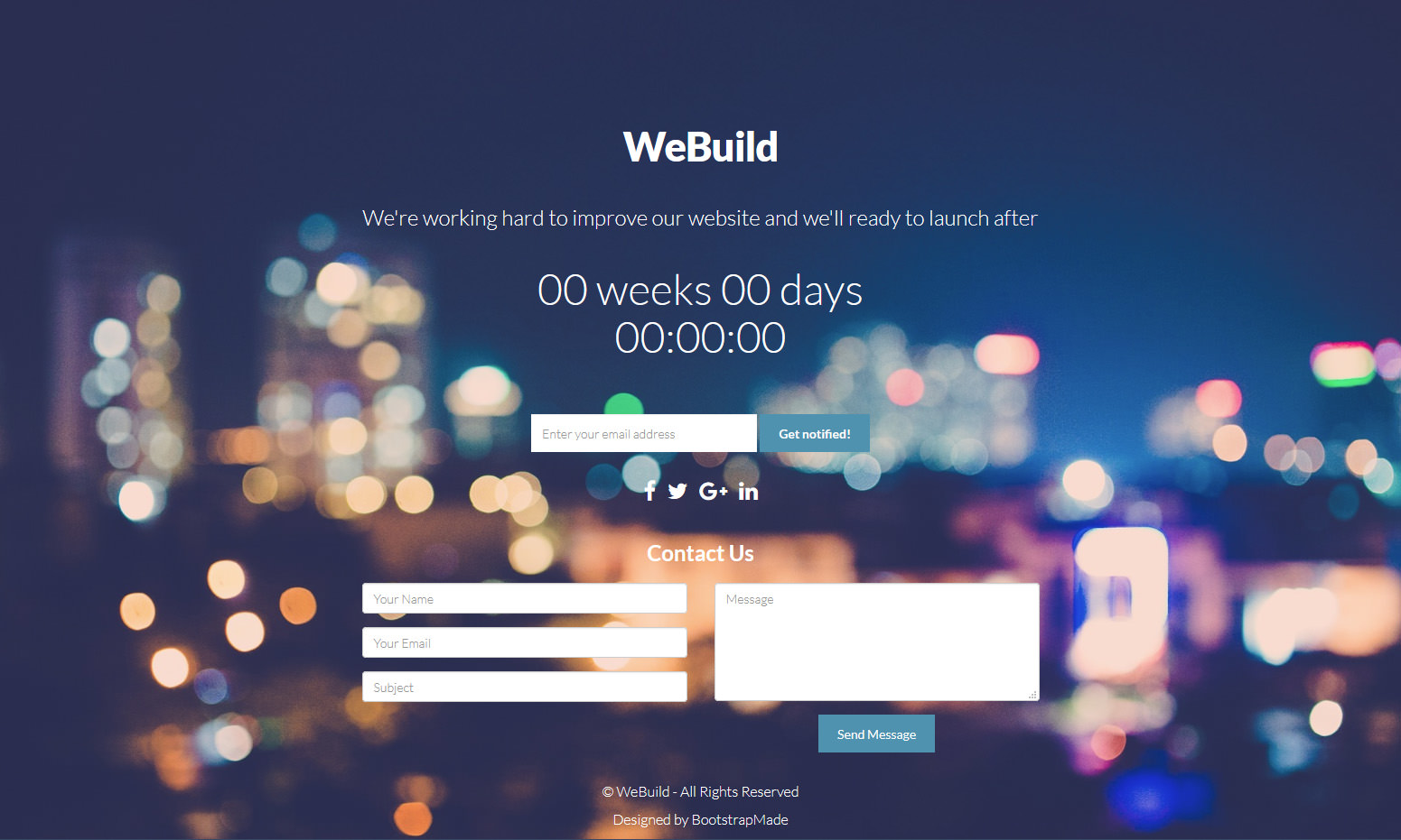 WeBuild is a bootstrap 3 coming soon template. Simple, flat and minimal design with jQuery countdown and polygonal background. If you are still working on your website and want to inform your users about the progress and keep them checking again your website using a “Coming Soon” template is the best way. Usually the coming soon themes are one page templates, packed with an Email subscriptions form and social network icons.