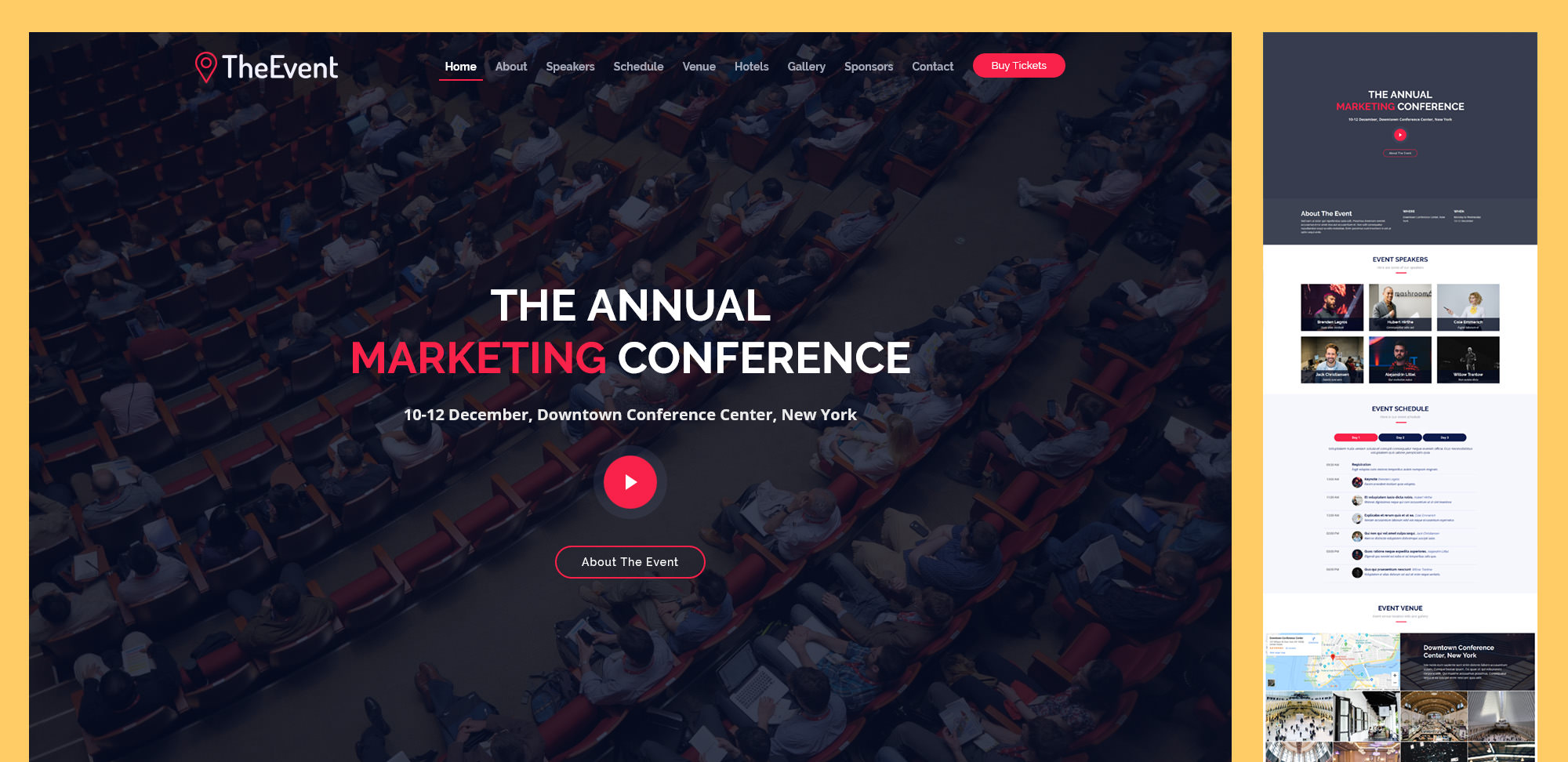 TheEvent comes with all the important sections required to create an event website like: full page introduction page with button to load a video in lightbox , about the event, speakers list, event schedule, event venue information and map, hotels list, image gallery, sponsors, F.A.Q, newsletter subscription, buy tickets with modal ordering form, contact form and others. It also comes with a separate template page for speaker detailed information.