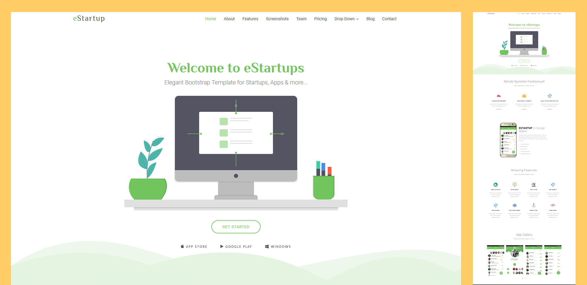 eStartup is a fully responsive template built with Bootstrap framework. It looks perfect on all major browsers, tablets, and phones. Some of the notable features and ready sections are: about us, features, screenshots carousel, team members, pricing tables, blog posts listing and contact form