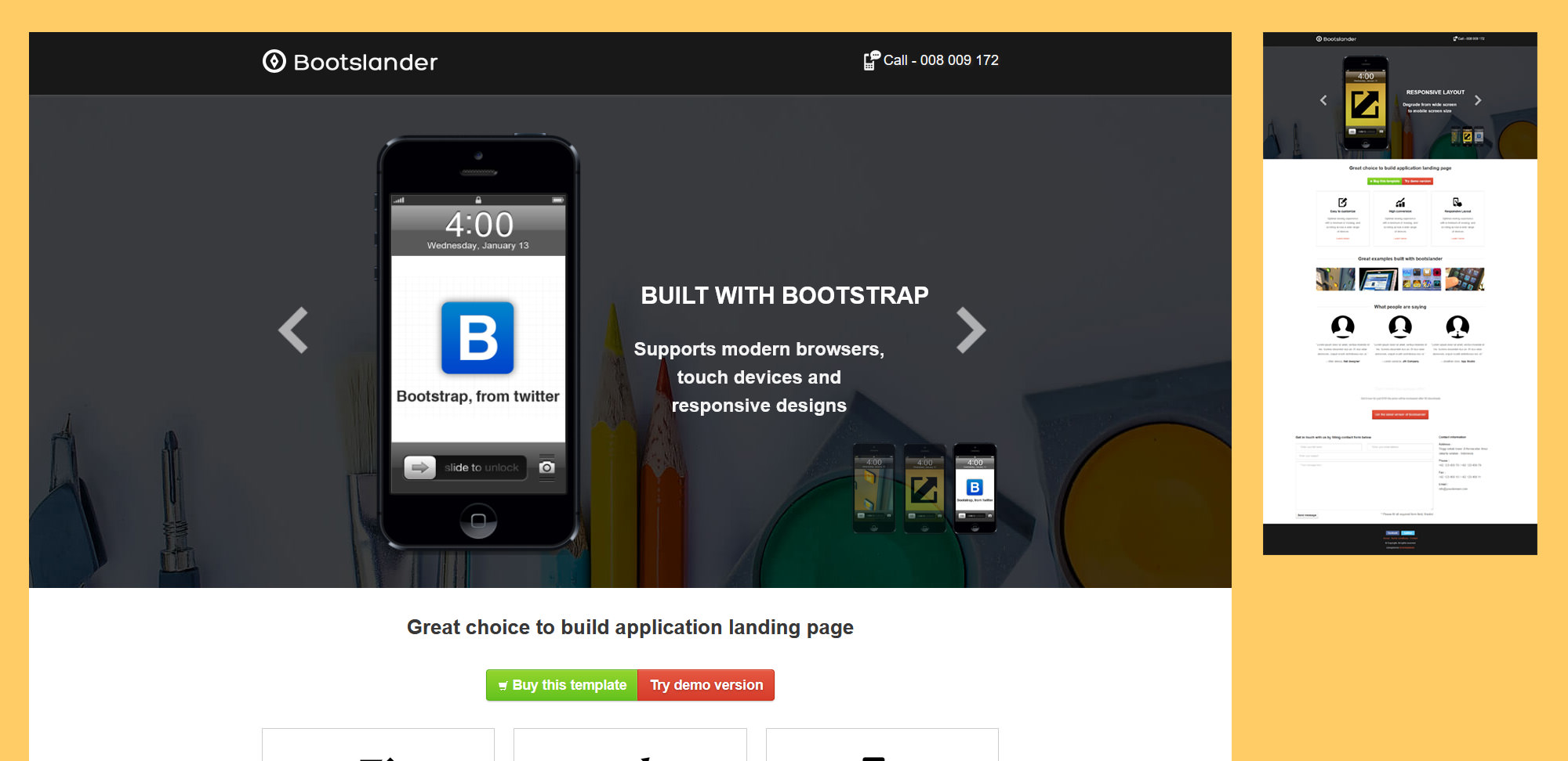 Bootslander is a light and easy to use landing page template built with Bootstrap. Suitable for apps, promoting software or service. Easy to customize and edit to it your needs, also the source codes are well commented