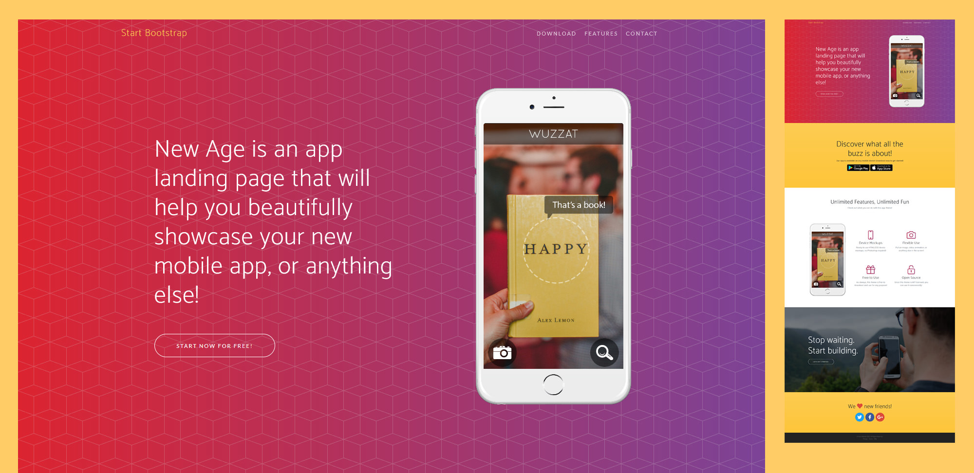 New Age is a Bootstrap app landing page theme to help you beautifully showcase your web app or anything else! This theme features a bold, colorful design with various content sections that will be an excellent boilerplate for your next Bootstrap based project! Easy to use HTML5/CSS Device mockups, just drop in content, no Photoshop or image editing necessary!