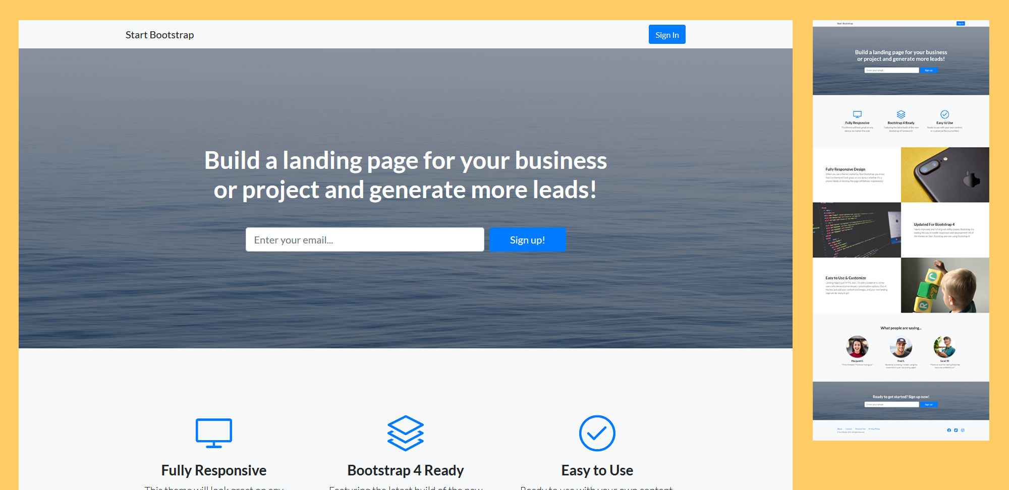 Landing Page is a responsive landing page theme for Bootstrap 4. Responsive content sections to showcase the features of your product or service. A simple testimonials section.