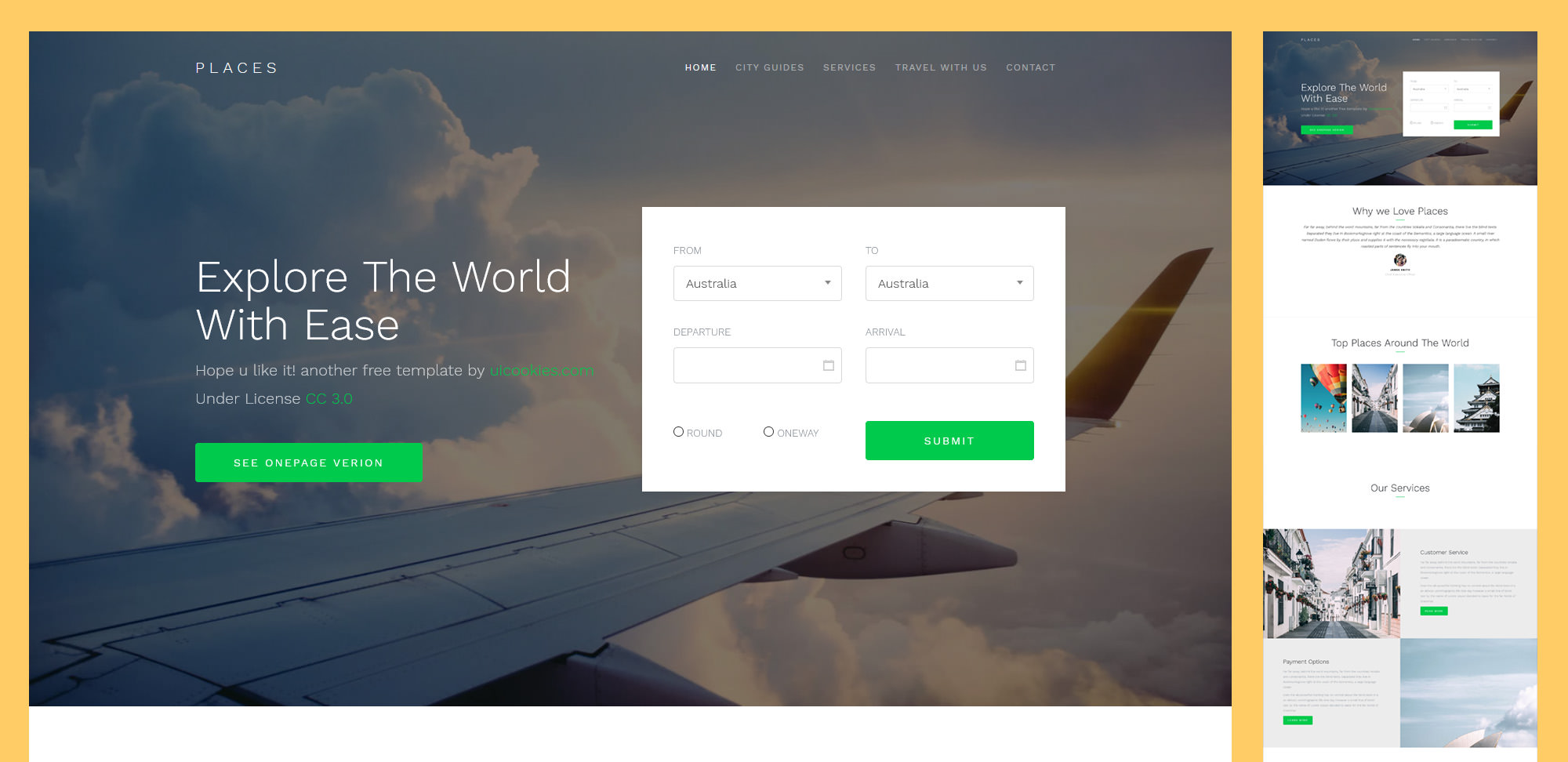 Places is a free Bootstrap 4 template perfect for travel agencies but not limited to it you can actually customize the elements, colors, etc. to suit your needs. It has a select2 dropdown for from or to form fields, bootstrap datepicker for a date. Animation included making your site look cool and sleek. There are two versions on this template Onepage and Multipage.