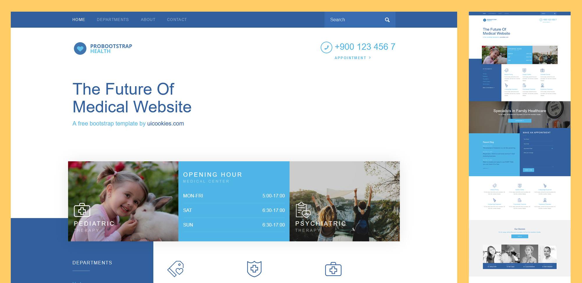 This template includes special features like appointment forms, services, doctors, gallery items, testimonials and much more. Key Features includes HTML5, CSS3 and jQuery, Font Awesome Icons, Custom made icons, Fully Responsive, Easy customization, Well and easy commented code, Cross browser compatibility, and Great color combinations