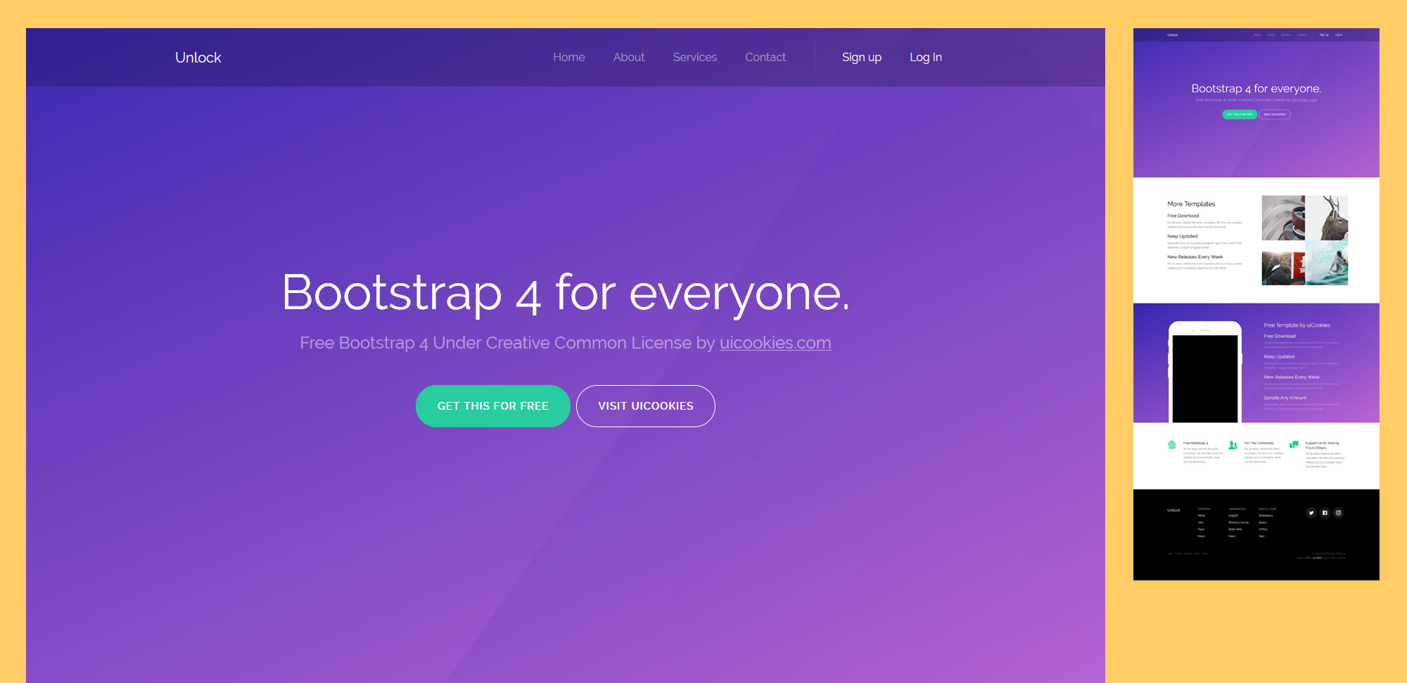 Unlock is a free Bootstrap 4 website template perfect for app and services landing page and for any other business websites. It has a modern and elegant design intended for business, corporate, app showcase and many others.