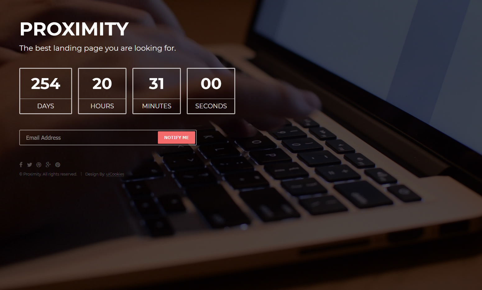 Proximity is the best under construction website template built with Bootstrap 3 frontend framework, HTML5, CSS3 and other modern technologies. The coming soon landing page template is clean, beautiful, captivating, mind-blowing, excellent, minimal and aesthetically simple creation of uiCookies. The website template is a lightweight and fast loading piece in the directory which can warmly welcome your visitors and inform them of your upcoming official website launching date with a creative, impressive, incredibly dynamic and catchy countdown timer.