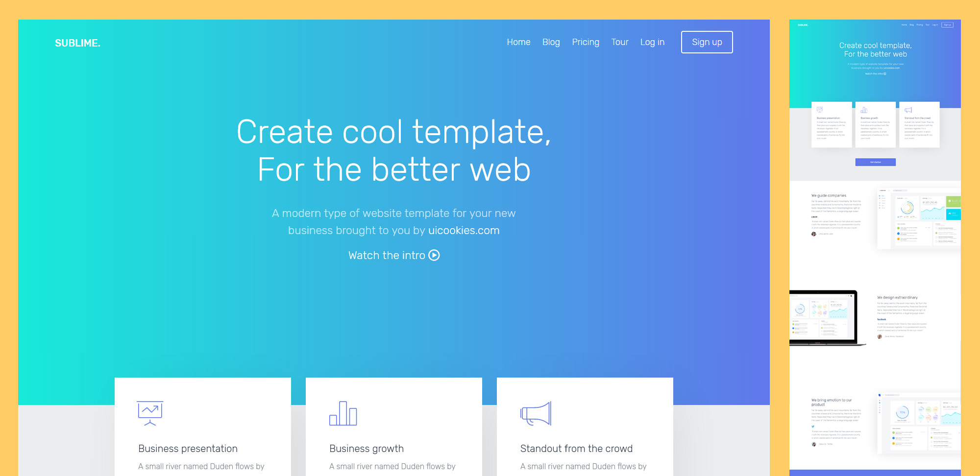 Sublime is a free responsive Bootstrap website template perfect to use as a landing page for corporate, business, startup, office, agency and general purposes. It has a smooth scroll animation it has also beautiful and elegant login and signup and pricing table pages. Built using sass and gulp for easy to customize.