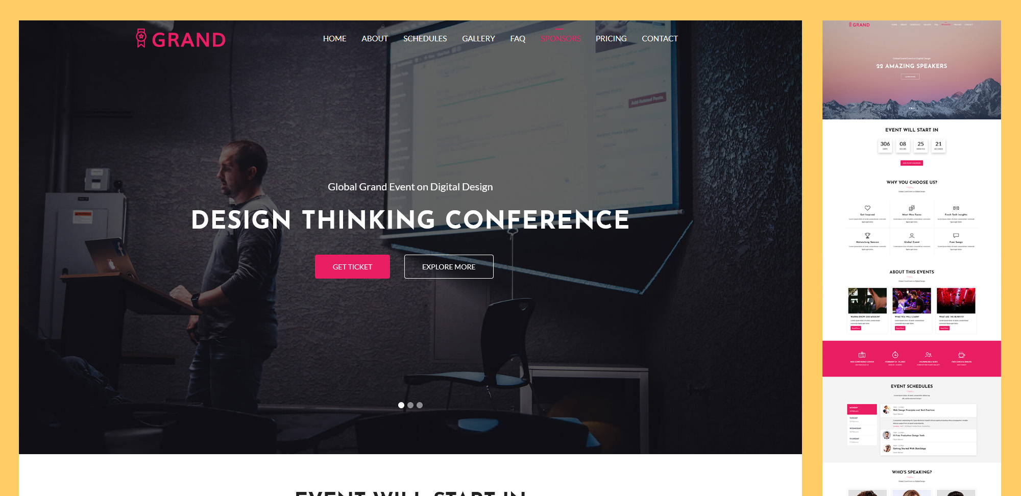 Grand is free event and conference html5 bootstrap 4 website template. Comes with all required elements to launch a complete conference or event website in no time. This is very well-designed web template specially, crafted for stunning event and conference websites. Its’ a free template with all essential features you need.