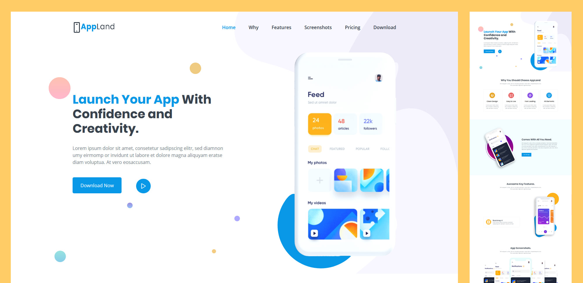 AppLand is a Free and Premium App Landing Page Template specially designed for app landing, software and SaaS landing pages. AppLand provides a creative, unique and simplified way to showcase and represent your app. AppLand comes with amazing design and all essential elements you need to launch a complete and impressive app landing page. Its clean and beautiful design is based on Bootstrap 4 and HTML5 which is easy and extensively customizable.