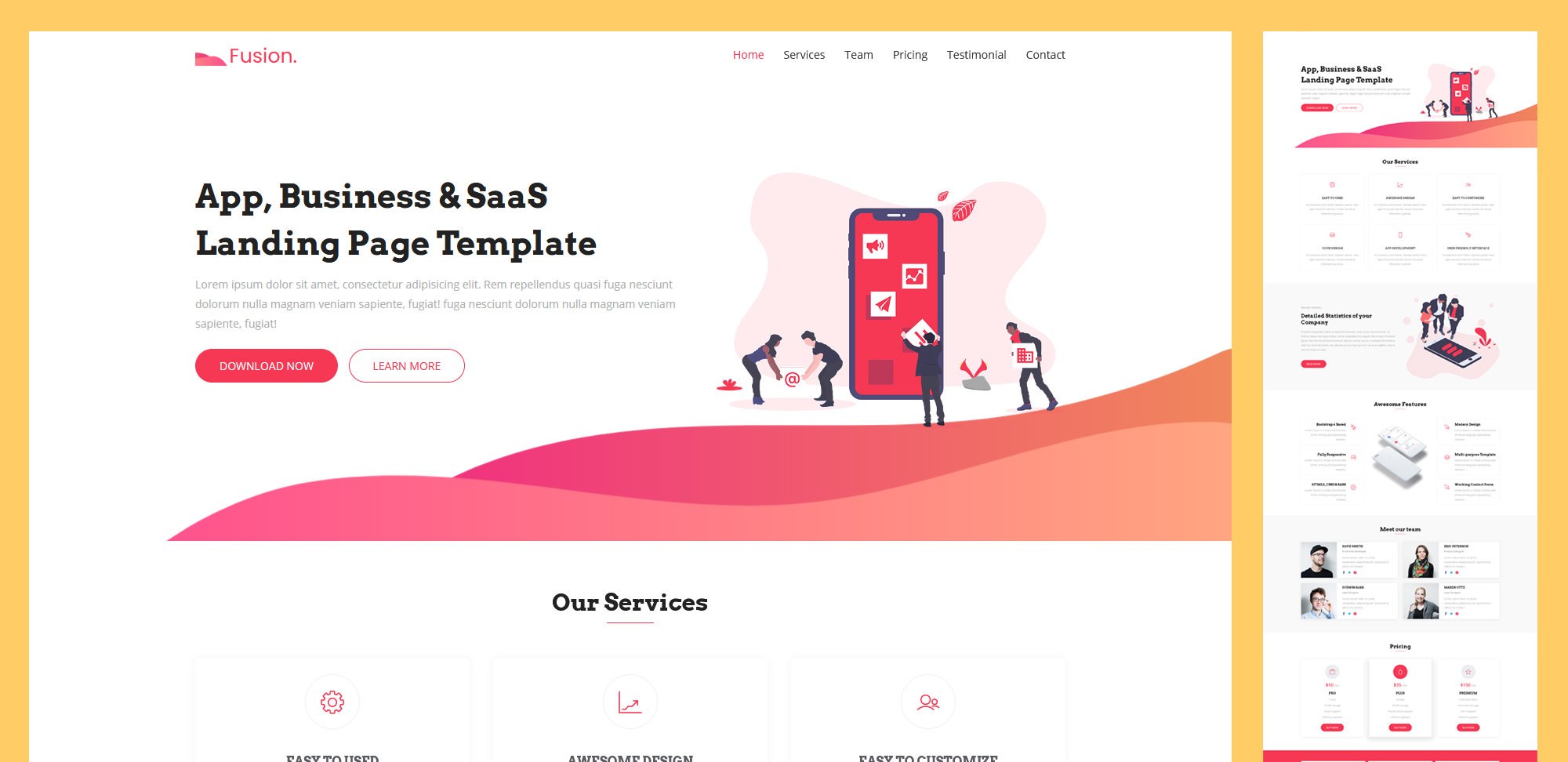 Fusion is High-quality Free and Premium App, Business, SaaS & Product Landing Page Template, equipped with the latest version of Bootstrap 4. Not only Fusion eases creating your landing page, but it also comes with modern & trendy design and all essential UI elements. The responsive layout of Fusion fits perfectly on all major screen-sizes. If you want to create or improve online presence and rebuild landing sites for products, businesses or apps, Fusion is a great choice for you.
