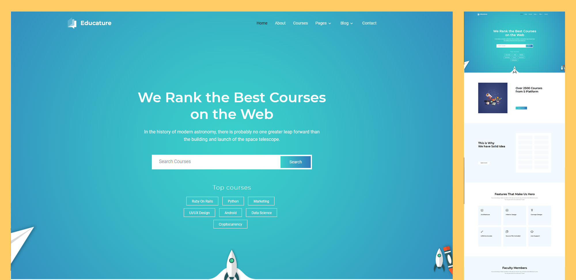 If you are looking for a way to start your own education platform, Educature is the free HTML online courses website template you should consider. It rocks a contemporary, high performing and eye-catchy web design that will cater to a broad audience. However, you can always feel free to adjust and enhance the look according to your needs and branding. After all, Educature is very simple to use for you to get the most out of it.
