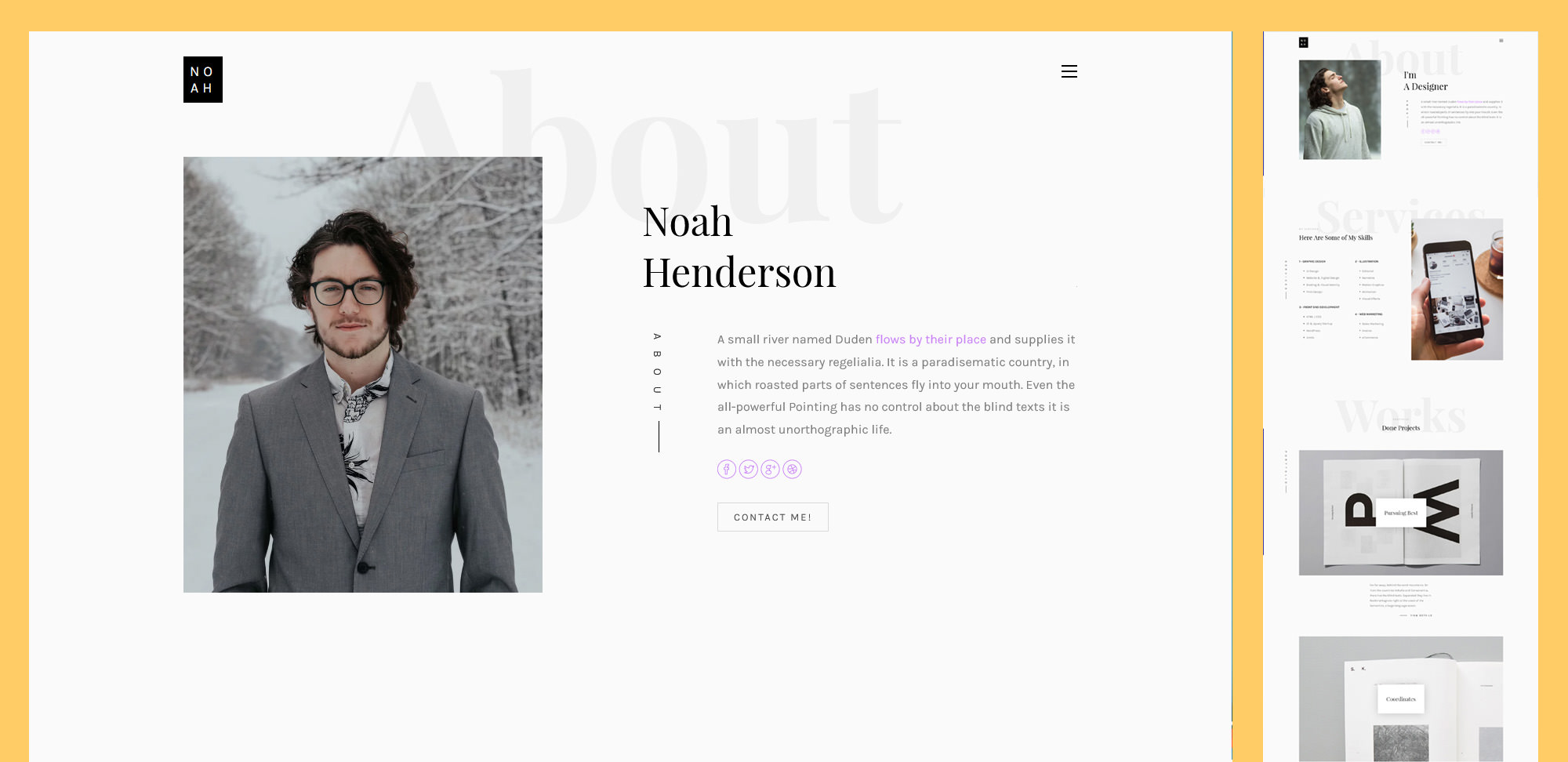 Noah is a mindblowing free personal landing page website template with a striking and enticing web design. Creative individuals, freelancers and job seekers, you can all greatly benefit from Noah and its peculiarities. First and foremost, the layout is pleasant and attractive, responsive, compatible with modern web browsers and optimized to the very last and smallest detail.