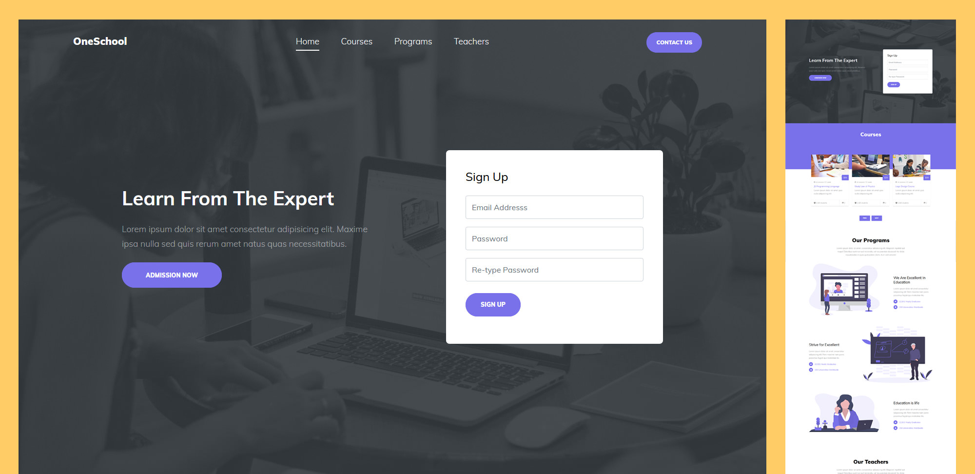 Oneschool is a professional and sophisticated free one-page education website template for schools, universities, online courses and more. It is a versatile tool that you can employ for an assortment of different purposes out of the box. And when you introduce your branding regulations, as well as additional customization tweaks, you can take Oneschool to a whole other level. You can now speed up the process of developing and establishing a striking web space thanks to the fantastic Oneschool.