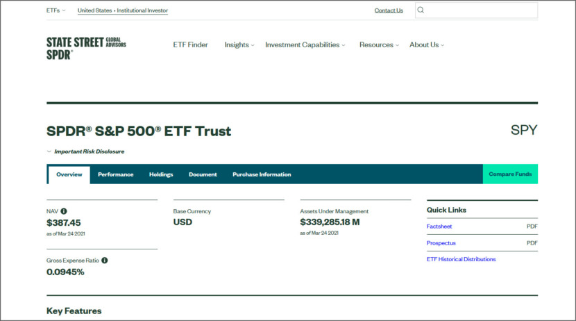 Launched in January 1993, SPY was the very first exchange traded fund listed in the United States. The SPDR® S&P 500® ETF Trust seeks to provide investment results that, before expenses, correspond generally to the price and yield performance of the S&P 500® Index (the “Index”).