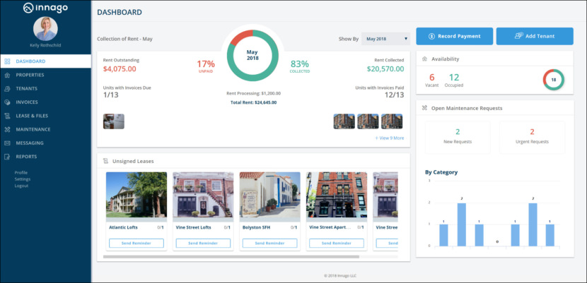 Innago allows you to easily: collect rent, screen tenants, list properties, manage work orders, create applications, sign leases, organize financials, communicate with tenants, & much more!