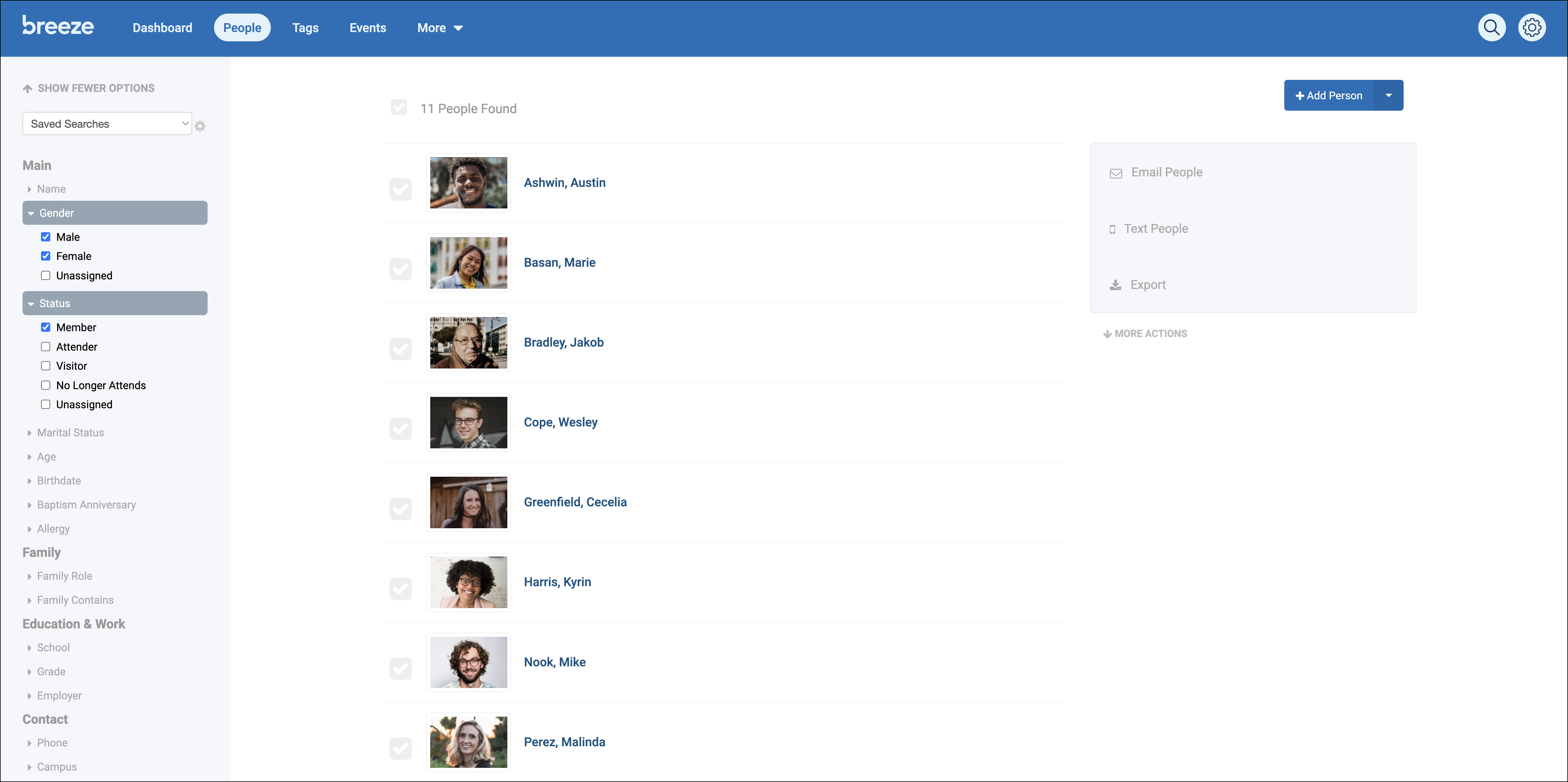 Breeze ChMS™ is a powerful, yet intuitive church management software used by more than 10,000 churches. It’s designed to help you save time, reduce frustration, and accomplish your church’s goals. Easy-to-use church management software to quickly organize people, groups, events, giving, & more.