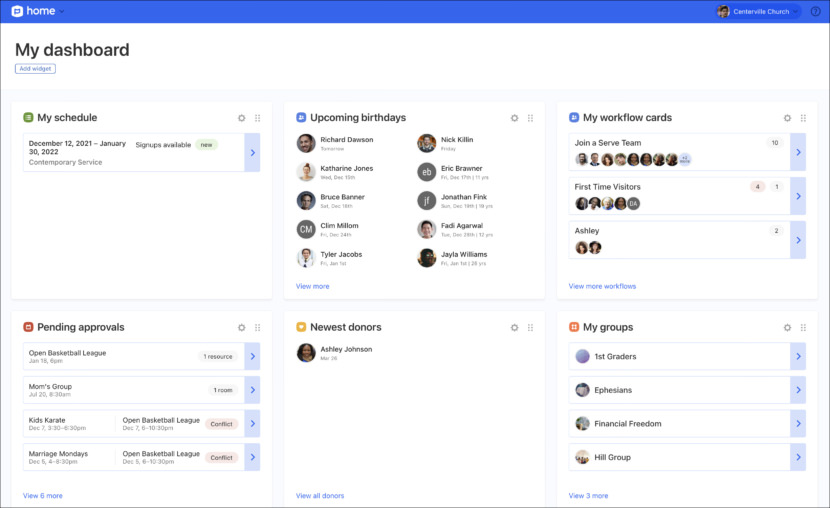 - Engagement Dashboard – Analyze attendance, donations, and more from a metrics dashboard.