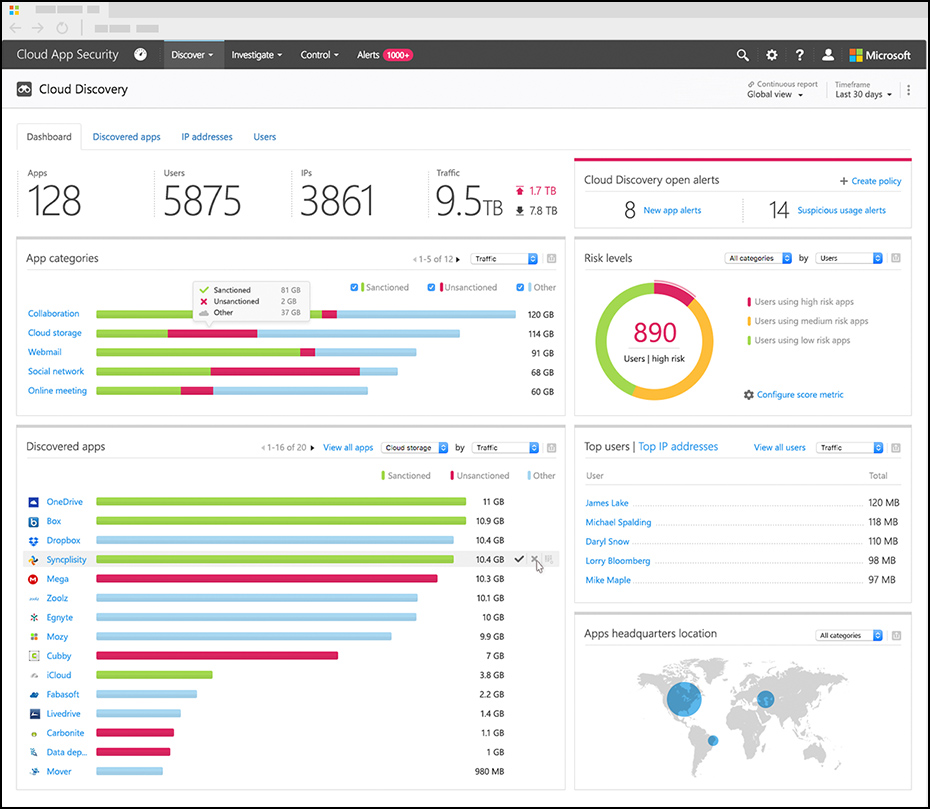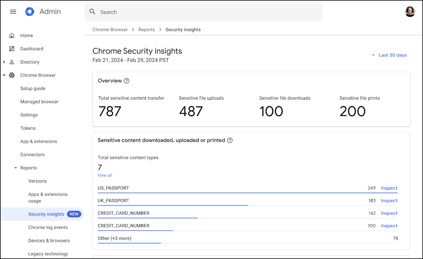 - Security insights – Get visibility into risky users, sensitive data transfers and other security events.