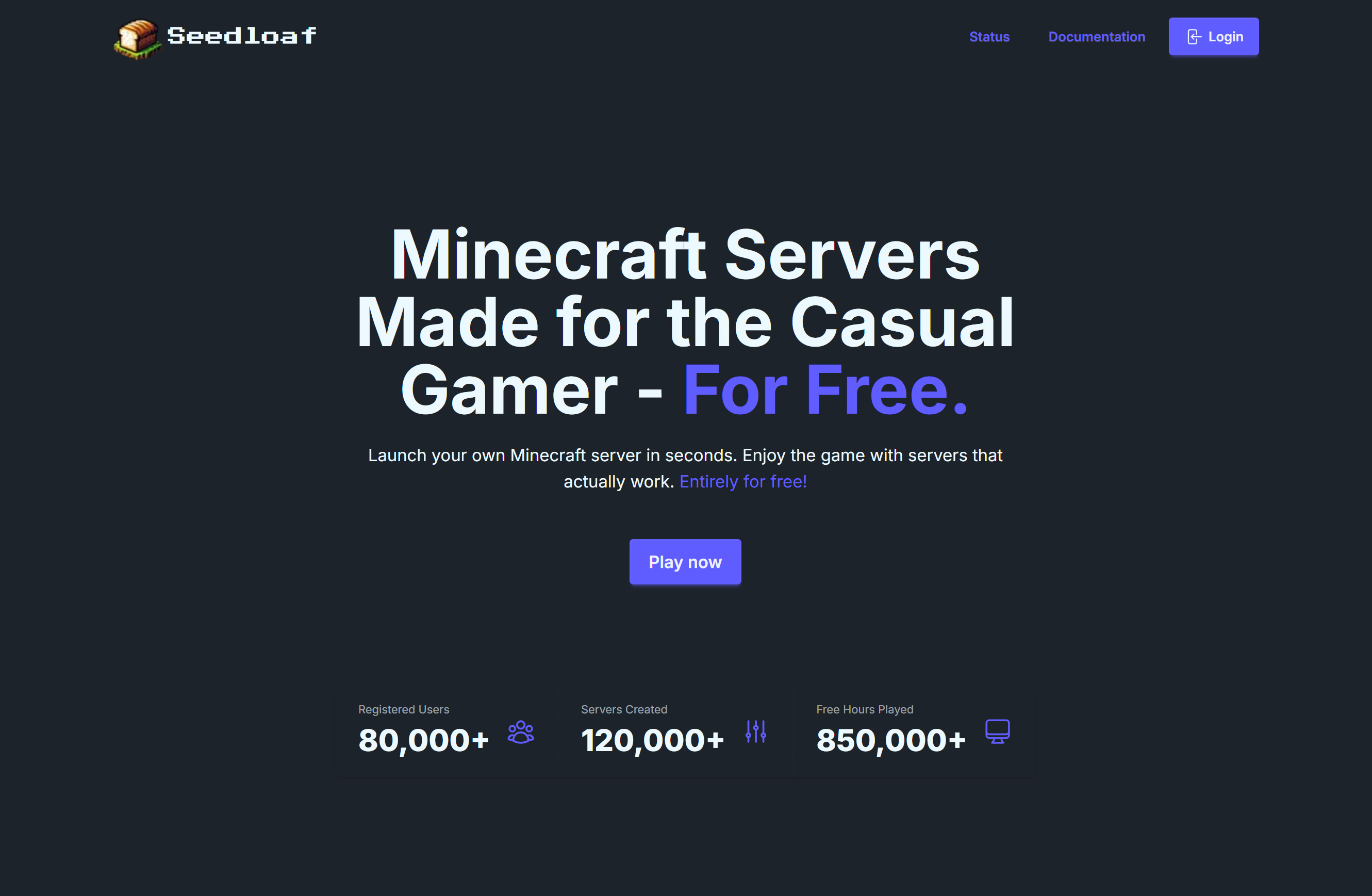 Launch your own Minecraft server in seconds. Enjoy the game with servers that actually work. Entirely for free! Seedloaf was inspired by what the team at PloudOS did. There are many options for free Minecraft servers, but there are so few which actually work. For some, it is because the hardware provided is not sufficient.