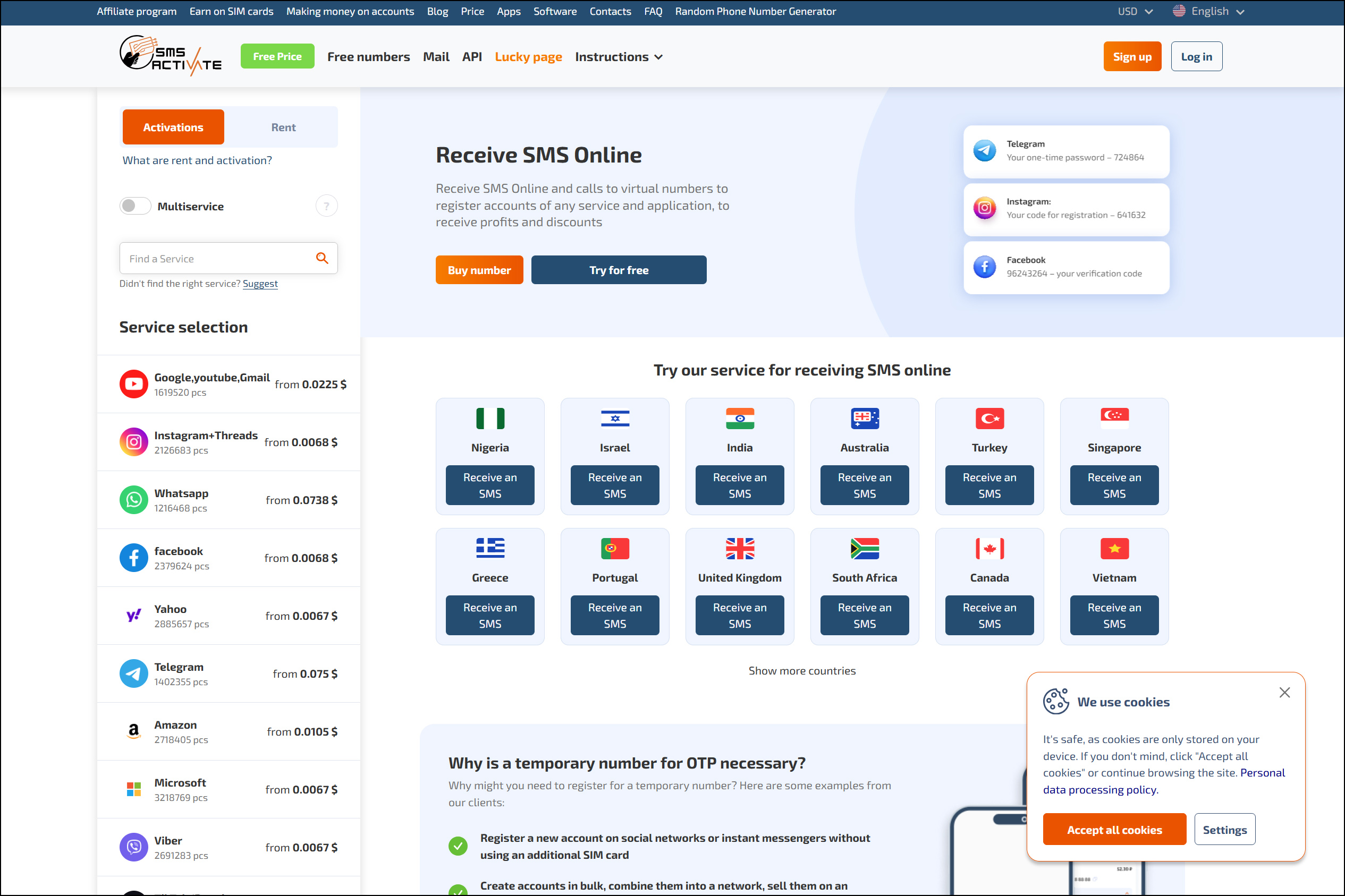 Tariffs for temporary virtual numbers for receiving SMS messages and SMS activation. Receive SMS online to virtual phone number, for private registration on various sites, services and apps in 90 countries and more than 1 million numbers.