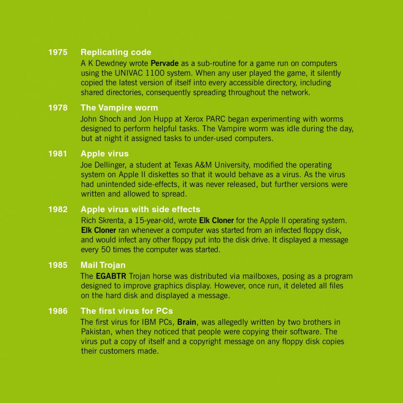 Nearly 30 years ago, the first computer virus was written (Elk Cloner), apparently with the intention of displaying a short poem when a computer booted up for the 50th time. If you’re looking for security tips, you’ll find the following tips in the book: