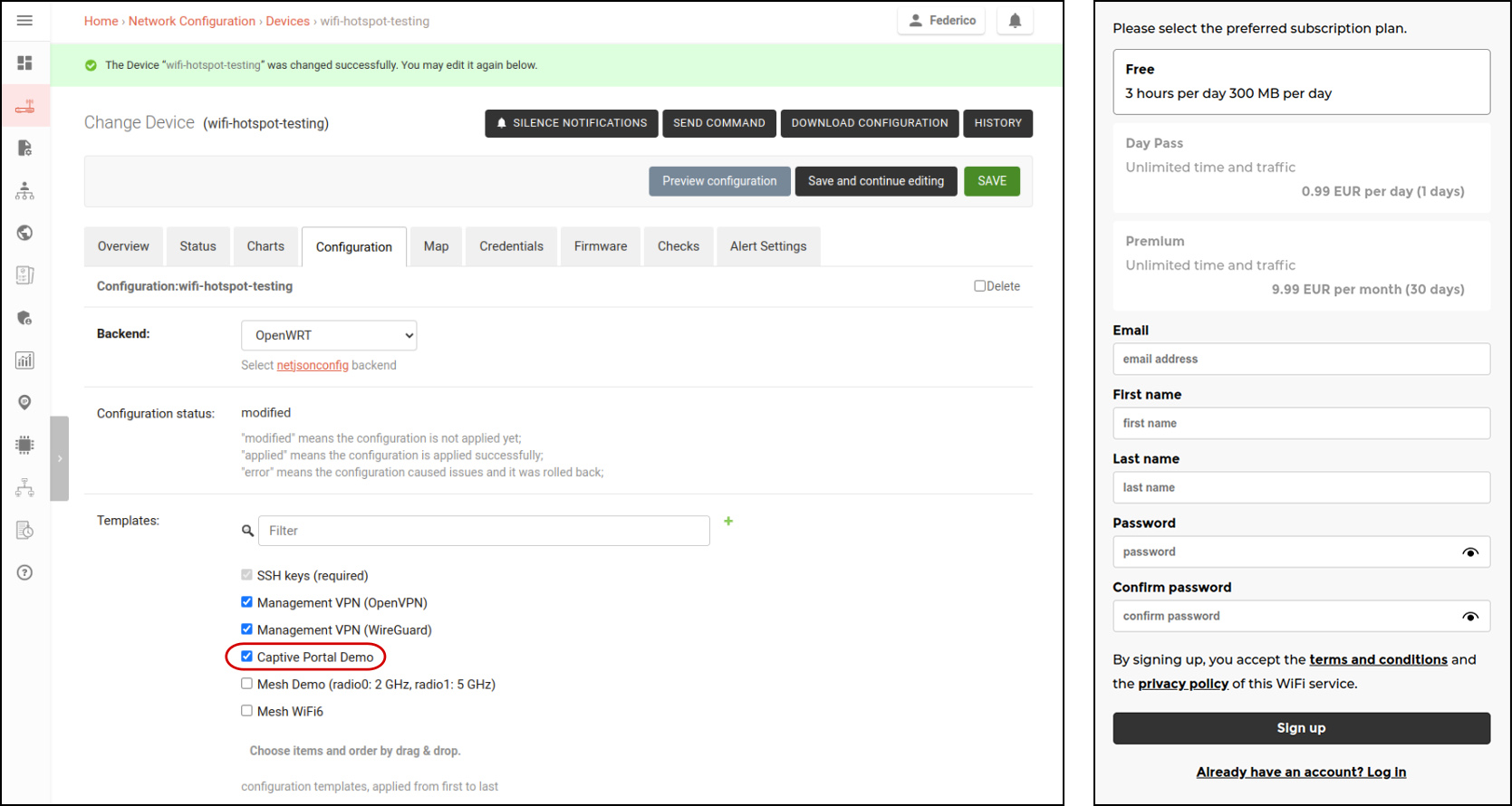 OpenWISP allows to automate many aspects of networks: from configuration to monitoring, RADIUS, hotspots, mesh and firmware upgrades, all backed by the reliability of the Linux Kernel and OpenWrt. Deploy hotspots and public WiFi Hotspot Management with captive portal integration for registration, authentication, social login, mobile phone number verification and paid subscriptions.